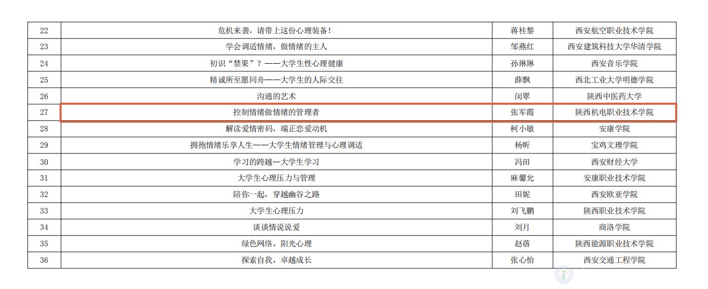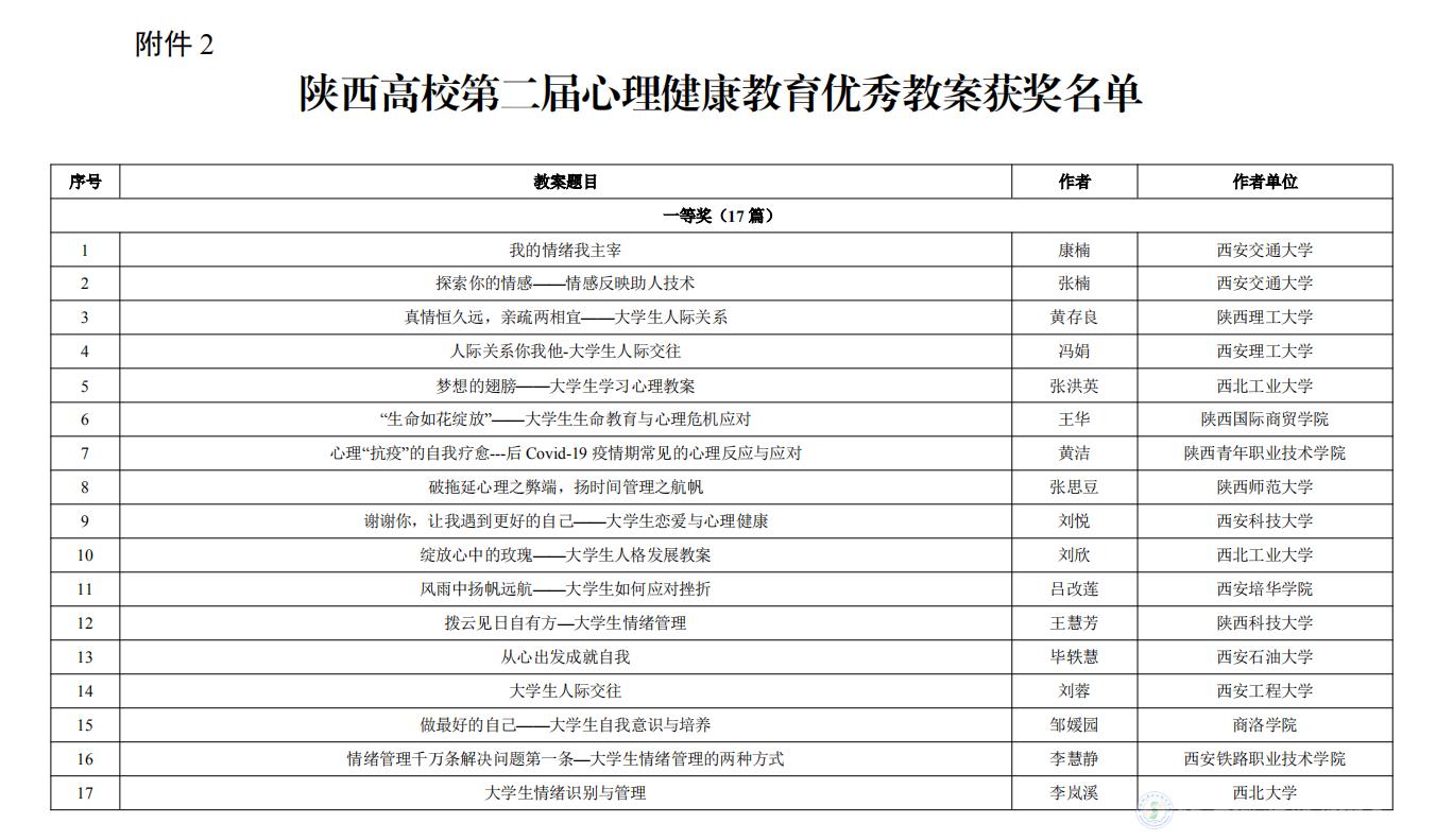 陕西机电职业技术学院参加陕西省委教育工委举办的第五届“阳光护航”心理育人宣传季实践系列活动,在第二届心理健康教育优秀教案评选活动中我校教师张玉琼所作题目为《触摸心灵打开人际关系的大门》的教案获得了二等奖、张军霞所作题目为《控制情绪做情绪的管理者》的教案获得了三等奖。