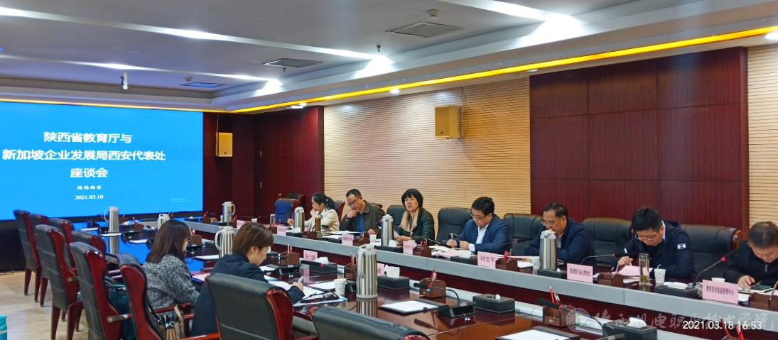 2021年3月18日下午,陕西省教育厅与新加坡企业发展局西安代表处座谈会在西安召开,出席此次座谈会的有陕西省教育厅副厅长刘宝平,新加坡企业发展局西安代表处主任袁颖,陕西省教育厅职成处、装备中心、外事处有关处室负责人以及省内部分高职院校代表。陕西机电职业技术学院党委副书记、院长向纪明、国际合作与交流处处长罗亚军参加了座谈。