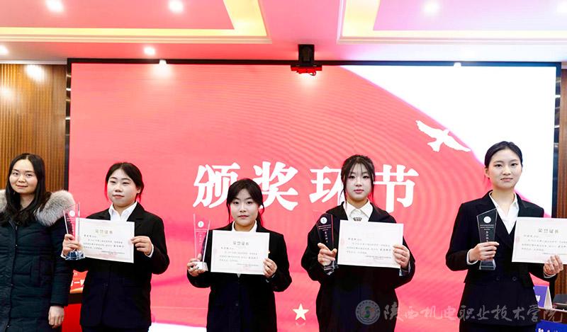 颁奖仪式现场,与会领导及评委为获奖队伍及其指导教师、最佳辩手颁发荣誉证书和奖品,为获得优秀组织奖的二级学院颁发奖牌。